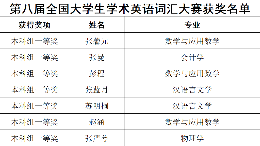 近日,第八届全国大学生学术英语词汇竞赛复赛结果公布,我校学生获得一等奖7名、二等奖33名,三等奖66名、优胜奖124名。